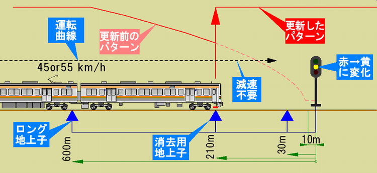 さきほどの図では、消去用地上子は信号機手前210m(TR-210)の一箇所ですが、列車密度の高いところでは円滑な運転を考慮して、85m手前・400m手前などにも増設されています。しかし、運転士がパターン更新を知り得なければ、宝の持ち腐れ。せっかくの地上子増設も意味をなさない状態が続いていました。