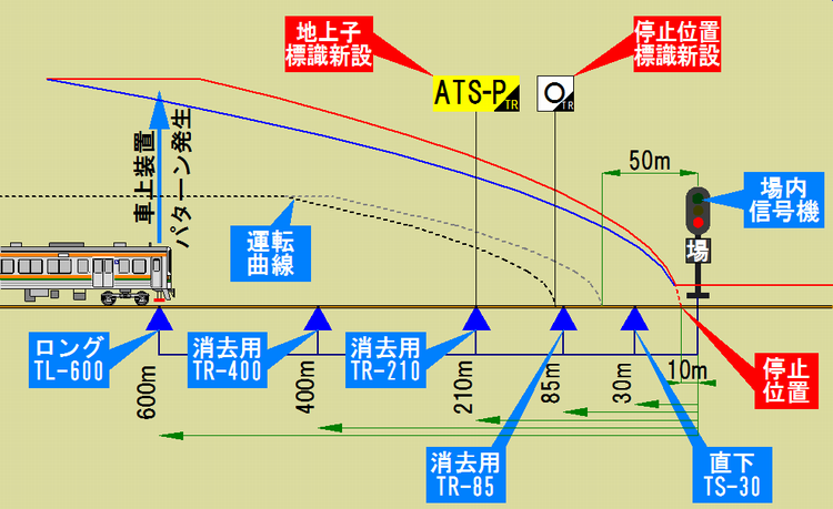 つまり、所定では50m手前であった停止位置を、消去用地上子TR-85の直前に変更するというわけです。