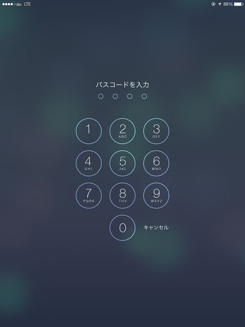 まずは、ロック画面とパスワード画面です。以前のiosは視認性重視で太い角ゴシック系のフォントが使われていましたが、ios7ではフーツラ系の細いフォントが多用されています。