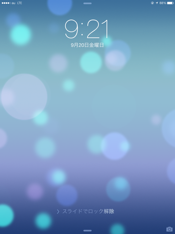 画像のロック画面の壁紙はios7で追加されたもので、「ダイナミック」に分類されているもの。本体を傾けると、水玉が動きます。
