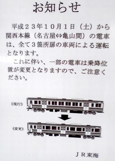 平成23年10月1日(土)から関西本線(名古屋⇔亀山間)の電車は、全て3箇所扉の車両による運転となります。