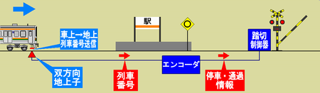 ただし、ATS-PTも車上→地上の伝送がないわけではなく、踏切警報定時間制御に応用されているものと考えられます。これは、駅に近い踏切などで「あかずの踏切」を避けるため、列車から地上に列車番号を送り、駅に停車するか通過するかによって、遮断機を下ろすタイミングを変えるものです。JR東海では東海道線でこのシステムを導入しており、ATS-ST形によって列車番号の車上→地上送信を行なっていました。ATS-PT導入にともなって、ST形車上装置は機能を停止していますので、列車番号の送信はPT形車上子から行なわれていると考えられます。