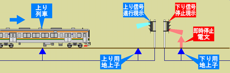 上りの信号機は進行(青)を現示しており、上り用地上子からも列車の運転を妨げる電文は送信していません。しかし、上りの信号機が進行であるということは、下りの信号は停止(赤)を出していることになります。