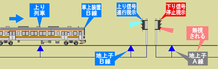 地上子からの電文には、地上子ごとにA線・B線の固有情報が含まれています。上図のように、車上装置の方向切換をB線に設定しておくと、B線の地上子情報のみを受取り、A線の地上子は無視します。これで情報が錯綜することはなくなります。