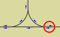 これは、一つの地上子で複数の機能を持たせられるメリットがある一方で、PT形のように無電源地上子を多用する方法の場合面倒なことにもなります。以下の図は、ATS-PT地上子を単線区間に設置した場合の図です。ここへ図の左側から右側へ向け「上り列車」がやってきました。