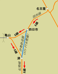 では、A線・B線をどの路線を主体に決めるかですが、伊勢鉄道直通ルートを主として決めているようです。四日市から伊勢鉄道で津方面へ直通する列車の運用を考えてのことでしょう。