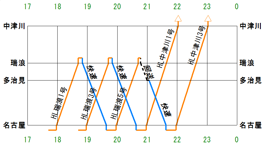 ご覧のとおり、18・19・20時頃のホームライナーが瑞浪止まりとなったこと、ちょうど瑞浪発名古屋行きの快速で帰ってこられることなどから、2行路で十分運用がまわります。これに313系8000番台を2編成並結した6両×2セット(4編成分)を突っ込めば、8000番台だけで夕方~夜間のホームライナーすべてを運行することもできます。8000番台は6編成ありますので予備も確保できます。