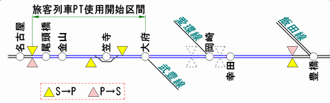 ところで、上の図を見てわかるとおり、笠寺の前後にS→Pの切り替え標識が立っています。笠寺駅には貨物列車の発着線がありますが、ここはPTの設置範囲外らしく旧来のST形(SF形)で防護しているようです。構内の発着線付近にはP→Sの標識も見られます。