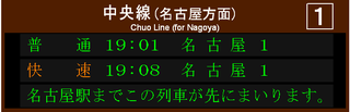 さて、発車標も少々バージョンアップがあり、快速より先に発車する普通列車がどの駅まで先に到着するか表示されるようになりました。この先着案内ですが、ホームにある発車標だけでなく、改札口の発車標にも表示されるようになりました。ホームの発車標は2段表示ですが、改札口は3段表示。その結果、こんな感じになります。