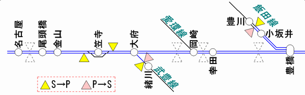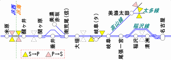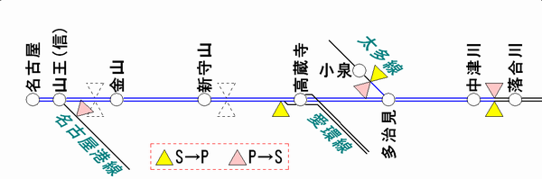 平成22年度における中央線のATS-PT整備区間は名古屋から中津川までです。P⇔Sの切替区間は中津川の落合川方にありますので、名古屋口の大半の列車はもっぱらPTのみを使用することになります。なお、名古屋港線・愛環線はATS-PT整備の対象外、太多線は来年度の整備範囲ですので、山王信号場・高蔵寺・多治見付近にはP⇔Sの切替標識が立っています。