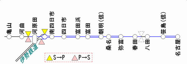平成22年度における関西線のATS-PT整備区間は名古屋から河原田まで。その先、亀山までは来年度の整備範囲です。伊勢鉄道線はATS-PT整備対象外ですので、関西線との分岐箇所にP⇔Sの切替標識があります。なお、伊勢鉄道の車両は四日市まで関西線に乗り入れますので、PT車上装置を装備しています。