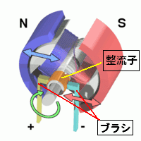 モーターは、界磁と電機子と呼ばれる二組の磁石で構成されています。この二組の磁石が、引き合ったり反発したりする力で回るわけですね。ただし、モーターを回し続けるには、磁石のN極・S極を回転に応じて入れ換える必要があります。でないと、磁石が引き合ったところで停まってしまいます。そこで直流モーターでは、回転する磁石を電磁石とし、回転に応じて電気の流れる方向を変えて電磁石の極を逆転するようにできています。このとき、回転する磁石に電気を送るのがブラシ。整流子はスイッチの役目をして、回転に応じて電流の向きを変えます。