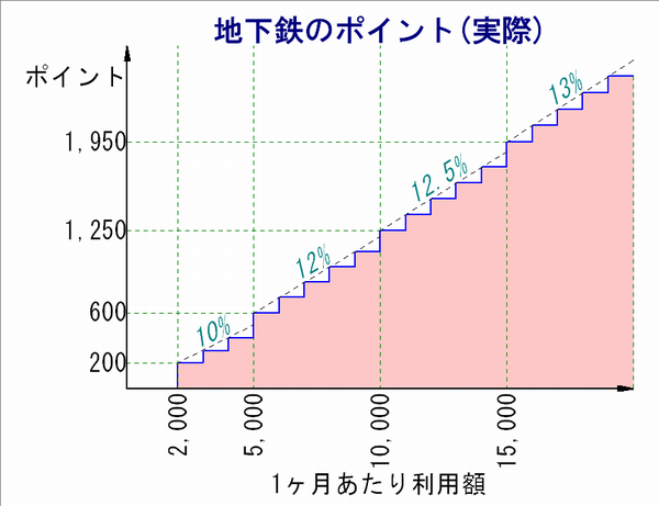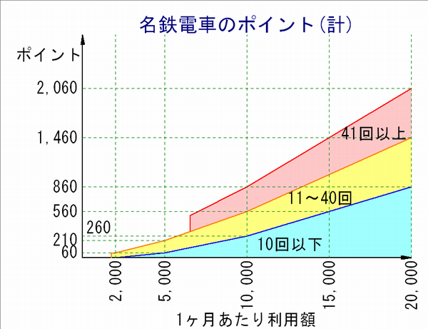 また、ポイントの計算方法は会社ごとに違います。地下鉄の場合は1ヶ月に2000円使えば、10%還元で200ポイント(200円相当)が戻りますが、名鉄は多くの場合、実際にポイントが付くのは2500円以上です。