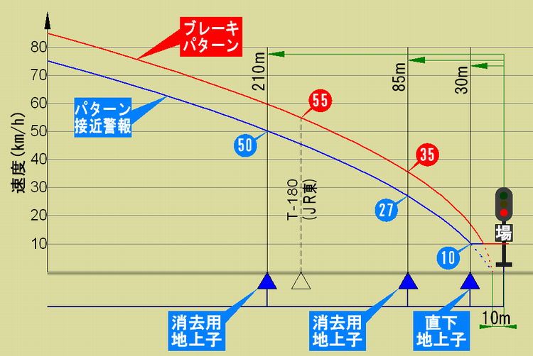 まず、JR東日本など通常のATS-Pの場合です。注意に変わったわけですから、列車は55km/hを保って信号機に近づいてきます。青い線と交差したところで、パターン接近警報が鳴りますが、信号が変わっていますから、そのまま進むと図のT-180を通過した時点でパターンは更新されます。ちょうどブレーキパターンが55km/hなので、一瞬ATSブレーキはかかるかもしれませんが、すぐに緩みます。T-180を通過してから信号が上位変化した場合でも、ATSブレーキで35km/hまで速度が落ちた時点でT-85を通過し、ブレーキは自動的に緩みます。