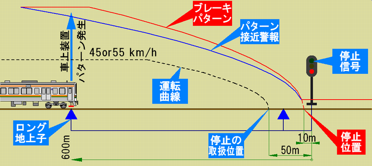さて、ATS-Pはパターンに当たる前に、警報音と警告灯でパターン接近を知らせます。ブレーキが作動する5秒前にパターン接近警報を発して、運転士に知らせる仕組みです(下図)。JR東日本ではパターン接近が鳴っても、運転士は割りと平気な顔をしていますが、JR東海では放置すれば非常ブレーキですから、慌ててブレーキをかける姿が見られます(苦笑)。結局のところ、運転取り扱いには