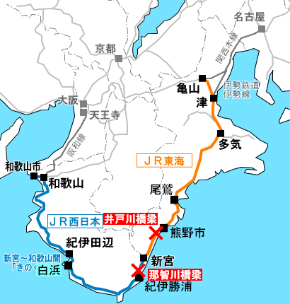 さて、鉄道の被害を見てみましょう。今回の台風では多数の河川が決壊しましたが、那智勝浦町の那智川橋梁(JR西日本・紀伊勝浦駅付近)および熊野市の井戸川橋梁(JR東海・熊野市駅付近)がそれぞれ一部流失したほか、盛土崩壊などの被害が多数発生し、9月7日現在で白浜・熊野市間の長い区間で不通になっています。