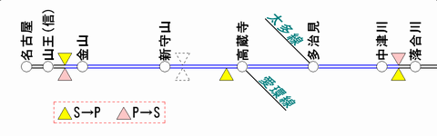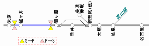その後、今年1月12日ごろから旅客列車でもPTの使用が開始されましたが、中津川でもPTを使用しており、落合川との間にATS切り替え標識が立っているとの情報をいただきました。しかし、高蔵寺の上り線には「S→P」がまだ立っています。どうやら、この標識は愛知環状鉄道線からの直通列車のためのものであり、昨年6月には中津川まですでに延長されていたと見るのが正しいようです^^;